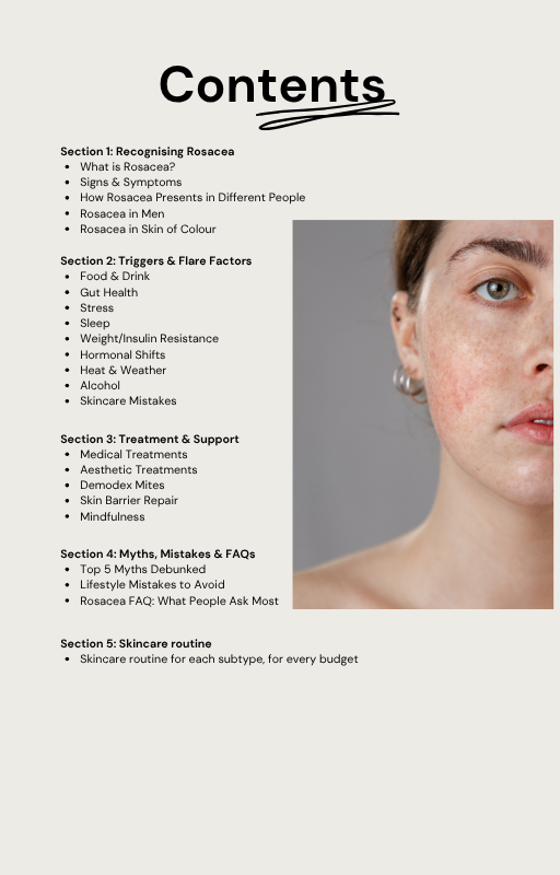 Discover the knowledge and tools you need to take control of your skin with Understanding Rosacea: A 21-Day Awareness Guide — a comprehensive, pharmacist-created digital resource designed to help you recognise, manage, and soothe rosacea.